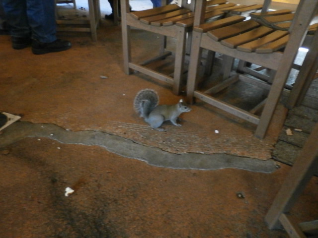 The proprietress of the place said not to feed it your French Fries because it would start pestering you to get your Fries .. we didn't feed it any but some ladies at another table kept tossing things other than Fries to it and the squirrel would check out whatever they tossed but wouldn't eat it .. the proprietress said French Fries were the only ting it would eat!!!
